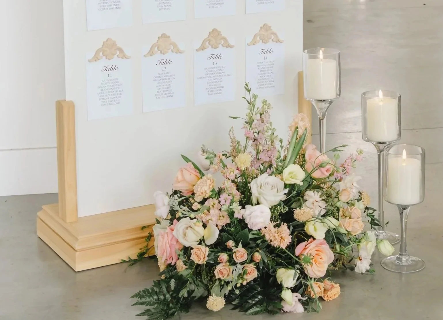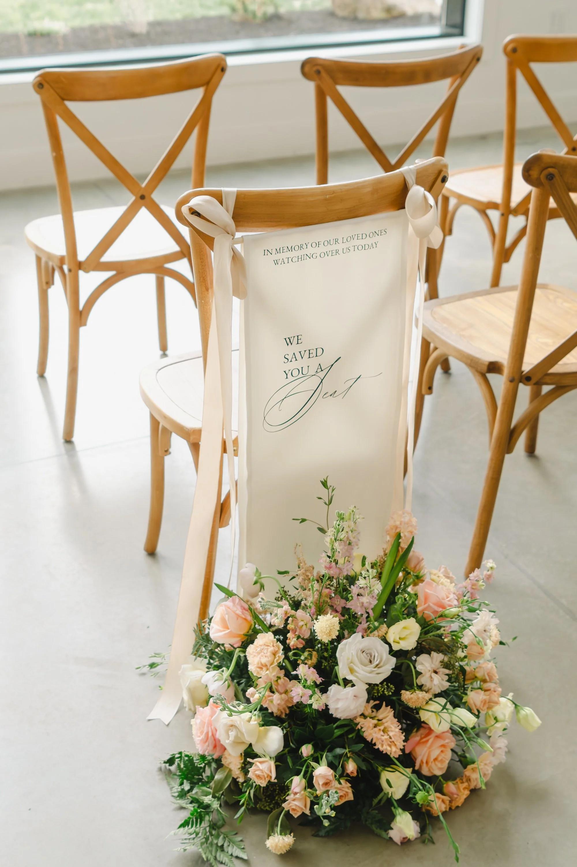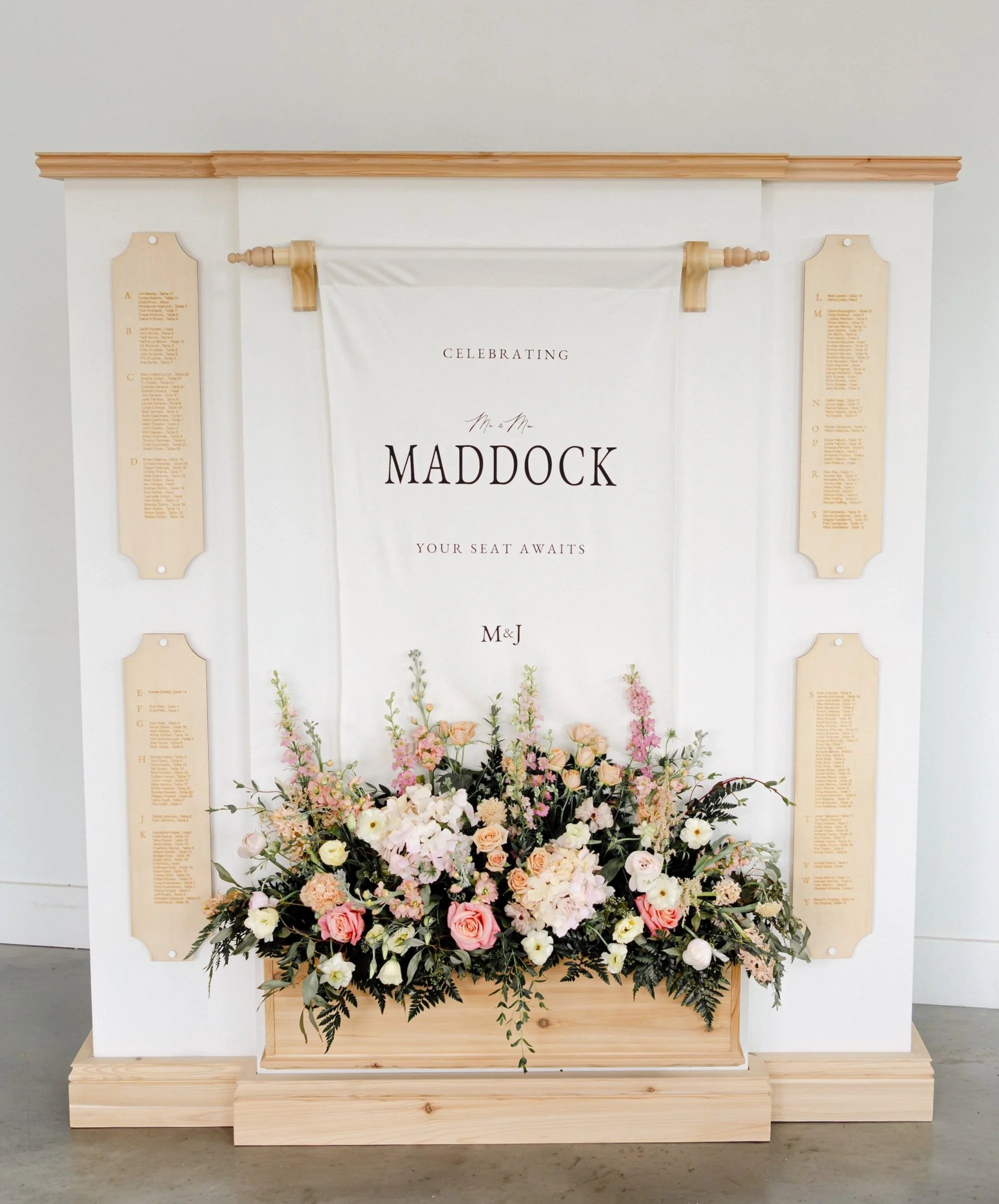 A statement in both form and function, this elevated seating chart features our signature linen banner, delicately etched name plates, and built-in cedar flower box for seamless cohesive styling.