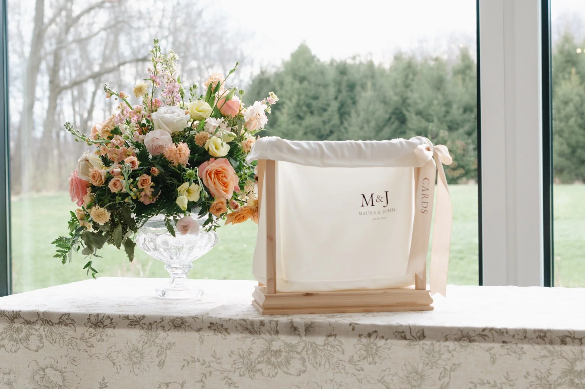 Our customized linen card bag, elegantly displayed in our crafted bracket is designed to collect cards and later serve as a keepsake for your treasured wedding mementos.