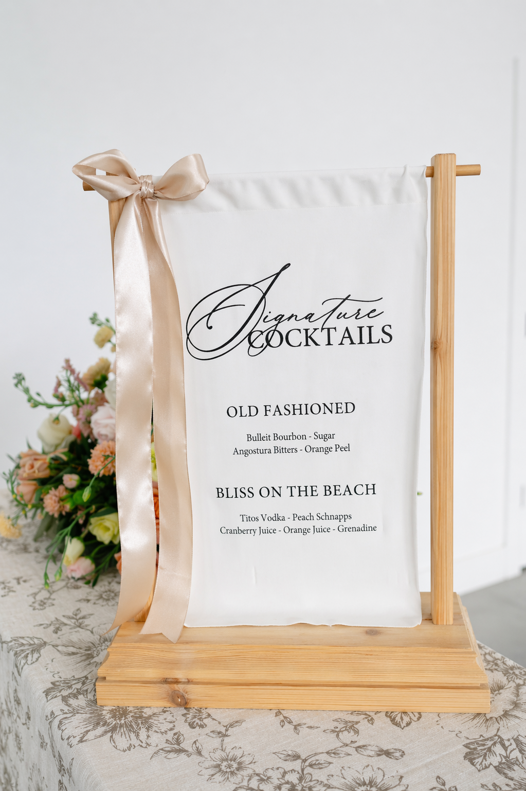 Premium weighted textile banner with top-hem includes an interchangeable hanging rod, allowing it to transition seamlessly from wedding day display to wall-art in your home.