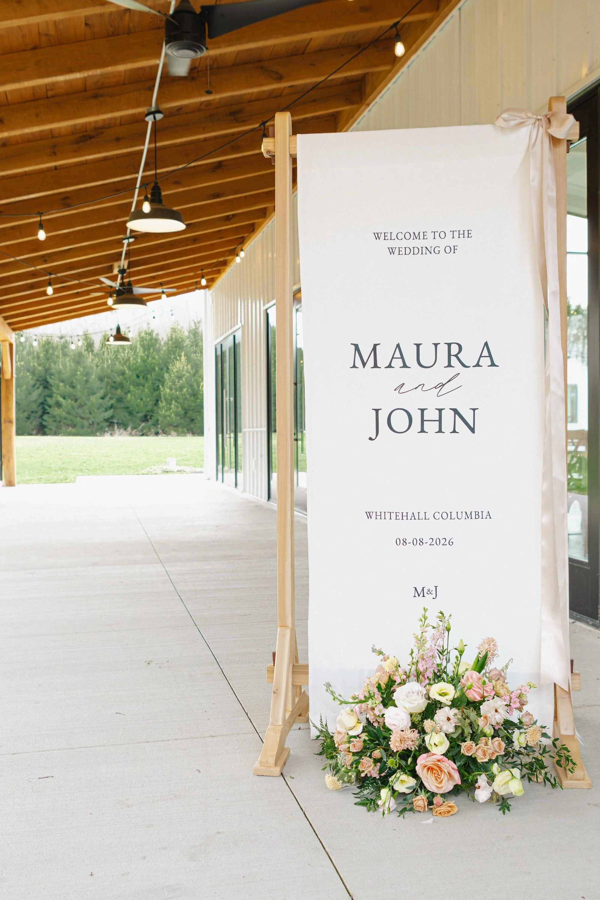 Welcome banner may be customized with your wedding monogram or crest and becomes a keepsake to cherish long after your celebration.
